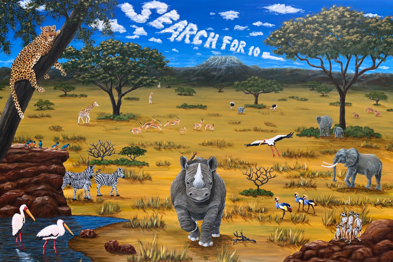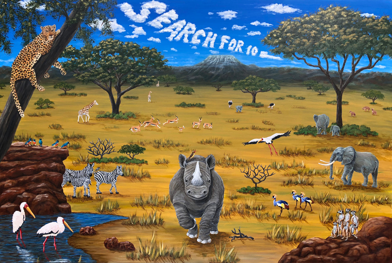 Embark on a safari right in your office with captivating wall art featuring majestic African plains animals in this 24"x36" artwork adventure. A total of 41 animals and birds await you. Clients, patients and customers will get caught up in searching for the 10 Hidden Objects.